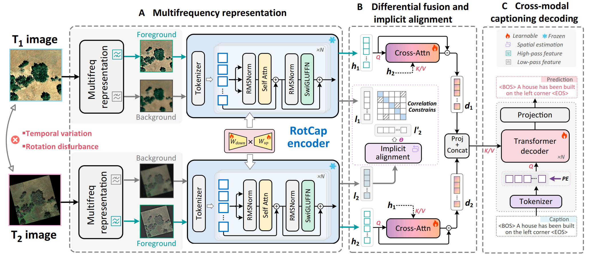 RotCap is built around a self-supervised multifrequency representation strategy. It separates each image into high-frequency and low-frequency components, allowing the model to focus on changed foreground objects while preserving relatively stable background structure for alignment. A cross-attention mechanism captures change patterns between bitemporal foreground tokens, while a self-supervised correlation constraint aligns low-frequency background tokens across time. On the LEVIR-CC-Rot15 dataset, RotCap improved BLEU-4 by 13.51% and CIDEr-D by 14.43% over the best competing method. On LEVIR-CC-Rot30, it achieved a 13.47% BLEU-4 gain over the next-best model. It also maintained strong performance on the original LEVIR-CC benchmark, showing good generalization in both disturbed and standard settings.